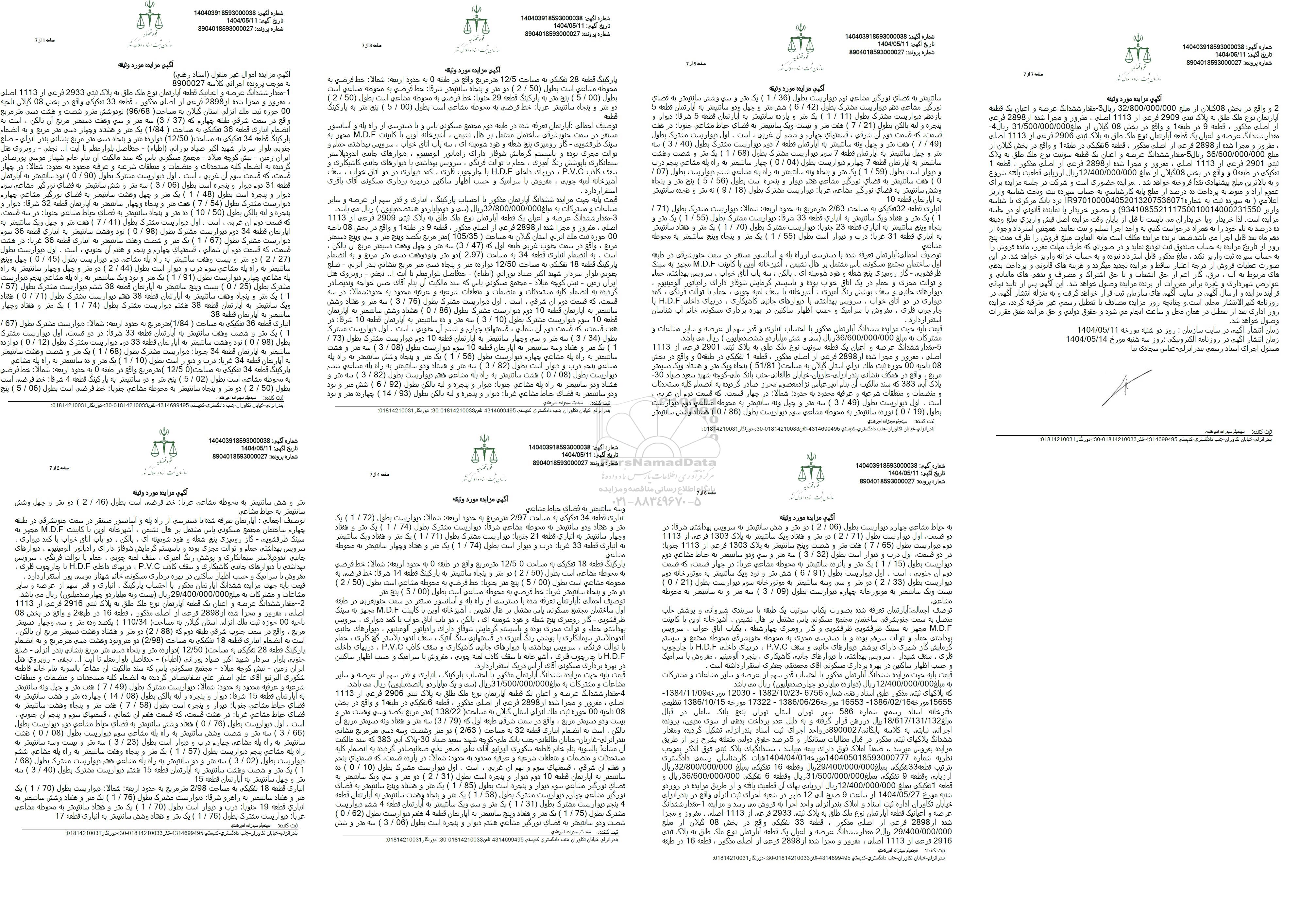 موارد مزایده: 1- یک قطعه آپارتمان به مساحت 96.68 مترمربع پلاک ثبتی 2933 فرعی از 1113 اصلی 2- یک قطعه آپارتمان به مساحت 110.34 مترمربع پلاک ثبتی 2916 فرعی از 1113 اصلی 3- یک قطعه آپارتمان به مساحت 105.35 مترمربع پلاک ثبتی 2909 فرعی از 1113 اصلی 4- یک قطعه آپارتمان به مساحت 138.22 مترمربع پلاک ثبتی 2906 فرعی از 1113 5- یک قطعه سوئیت به مساحت 51.81 مترمربع پلاک ثبتی 2901 فرعی از 1113 اصلی