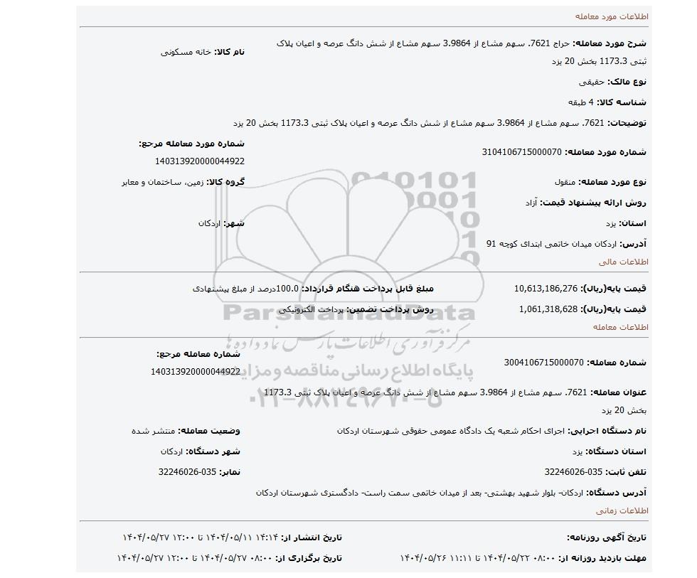 | شرح مورد معامله: حراج 7621. سهم مشاع از 3.9864 سهم مشاع از شش دانگ عرصه و اعیان پلاک ثبتی 1173.3 بخش 20 یزد | نام کالا: خانه مسکونی | |