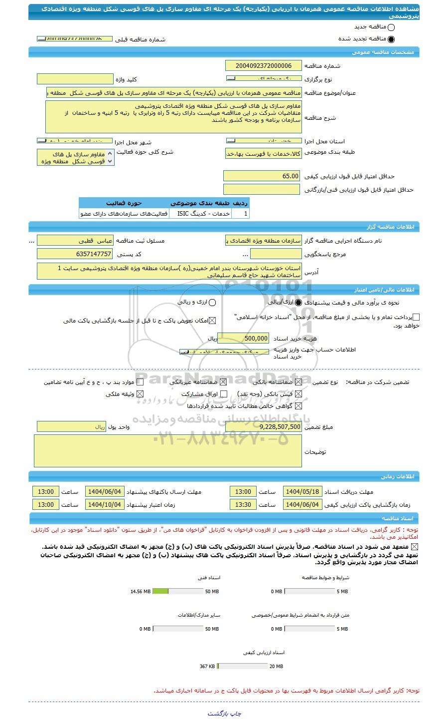 | نام دستگاه اجرایی مناقصه گزار | سازمان منطقه ویژه اقتصادی پتروشیمی خوزستان | مسئول ثبت مناقصه | عباس قطبی |