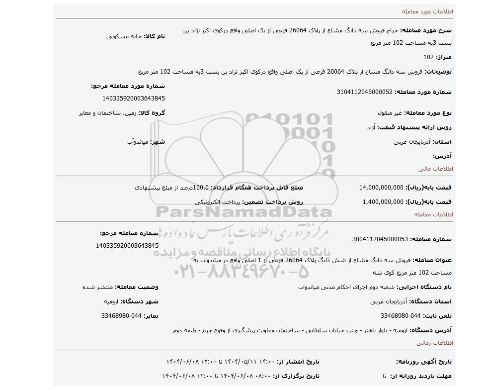 | عنوان معامله: فروش سه دانگ مشاع از شش دانگ پلاک 26064 فرعی از 1 اصلی واقع در میاندواب به مساحت 102 متر مربع کوی شه | ||