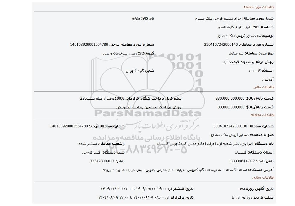 مزایده عمومی مزایده دستور فروش ملک مشاع برگزار میگردد. از کلیه افراد متخصص و شرکتهای واجد شرایط دعوت به عمل میآید تا در این مزایده با کد خبرگزاری پارس نماد : 9354247 شرکت نمایند تاریخ شروع مزایده : 1404/05/11 مهلت شرکت در مزایده: تا پایان روز 1404/06/09 مکان برگزاری اموال واگذاری استانهای گلستان و دستهبندیهای مربوط به این حراجی املاک و زمین میباشد.