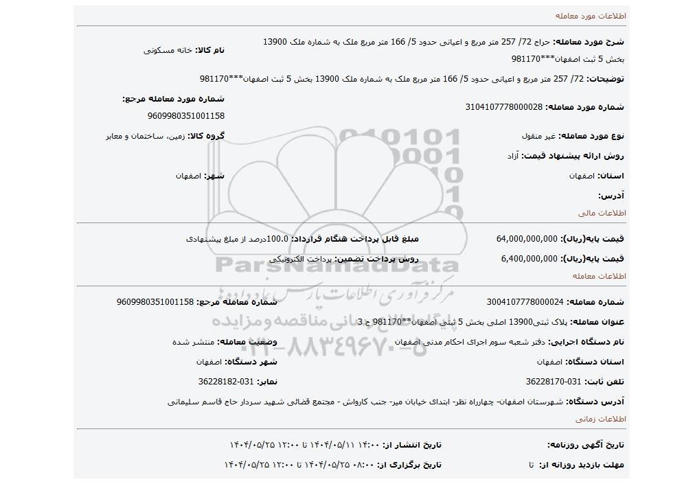 | شرح مورد معامله: حراج 72/ 257 متر مربع و اعیانی حدود 5/ 166 متر مربع ملک به شماره ملک 13900 بخش 5 ثبت اصفهان***981170 | نام کالا: خانه مسکونی | |