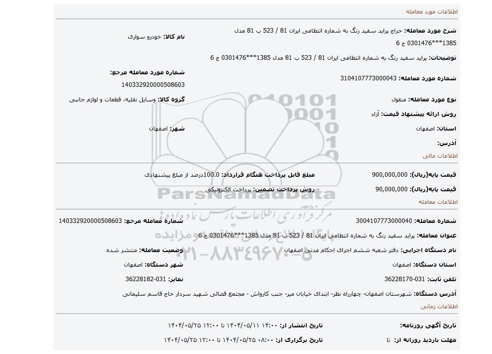 عنوان معامله: پراید سفید رنگ به شماره انتظامی ایران 81 / 523 ب 81 مدل 1385***0301476 ج 6