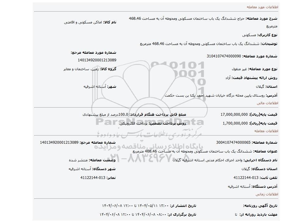 مزایده عمومی مزایده ششدانگ یک باب ساختمان مسکونی ومحوطه آن به مساحت 468.46 مترمربع برگزار میگردد. از کلیه افراد متخصص و شرکت‌های واجد شرایط دعوت به عمل می‌آید تا در این مزایده با کد خبرگزاری پارس نماد : 9354278 شرکت نمایند تاریخ شروع مزایده : 1404/05/11 مهلت شرکت در مزایده: تا پایان روز 1404/06/08 مکان برگزاری اموال واگذاری استان‌های گیلان و دسته‌بندی‌های مربوط به این حراجی املاک و زمین میباشد.
