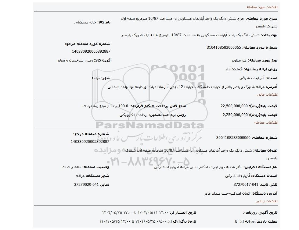 مزایده، شش دانگ یک واحد آپارتمان مسکونی به مساحت 10/87 مترمربع طبقه اول شهرک ولیعصر