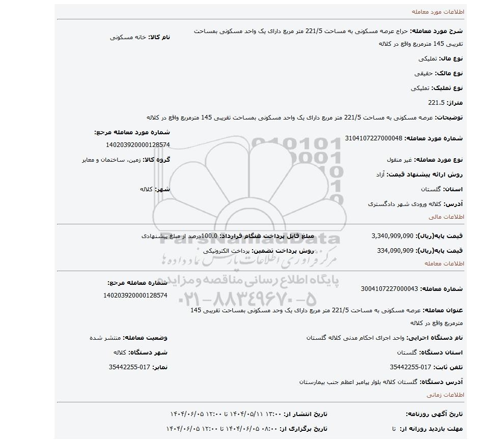 مزایده عمومی مزایده عرصه مسکونی به مساحت 221/5 متر مربع دارای یک واحد مسکونی بمساحت تقریبی 145 مترمربع واقع در کلاله برگزار میگردد. از کلیه افراد متخصص و شرکت‌های واجد شرایط دعوت به عمل می‌آید تا در این مزایده با کد خبرگزاری پارس نماد : 9354288 شرکت نمایند تاریخ شروع مزایده : 1404/05/11 مهلت شرکت در مزایده: تا پایان روز 1404/06/05 مکان برگزاری اموال واگذاری استان‌های گلستان و دسته‌بندی‌های مربوط به این حراجی املاک و زمین میباشد.