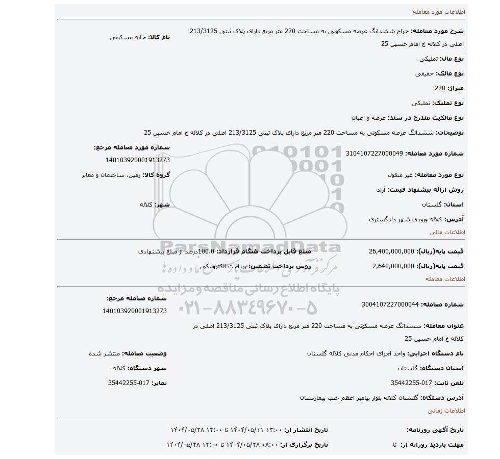 مزایده عمومی مزایده ششدانگ عرصه مسکونی به مساحت 220 متر مربع دارای پلاک ثبتی 213/3125 اصلی در کلاله خ امام حسین 25 برگزار میگردد. از کلیه افراد متخصص و شرکت‌های واجد شرایط دعوت به عمل می‌آید تا در این مزایده با کد خبرگزاری پارس نماد : 9354290 شرکت نمایند تاریخ شروع مزایده : 1404/05/11 مهلت شرکت در مزایده: تا پایان روز 1404/05/28 مکان برگزاری اموال واگذاری استان‌های گلستان و دسته‌بندی‌های مربوط به این حراجی املاک و زمین میباشد.
