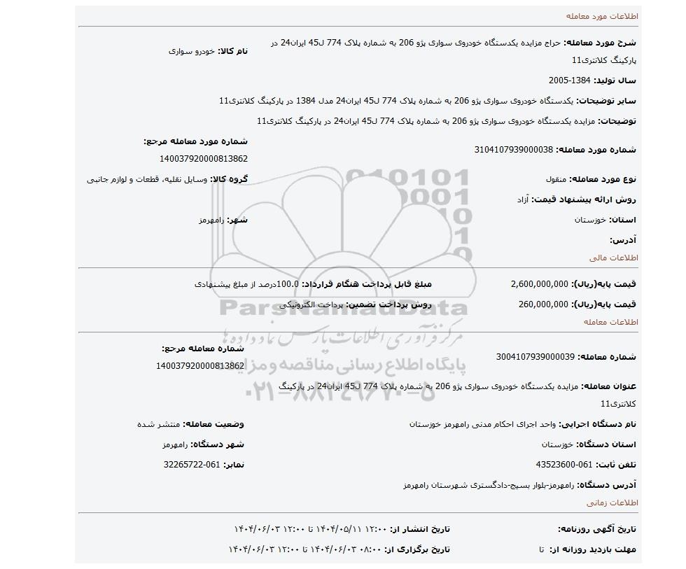 | عنوان معامله: مزایده یکدستگاه خودروی سواری پژو 206 به شماره پلاک 774 ل45 ایران24 در پارکینگ کلانتری11 | ||