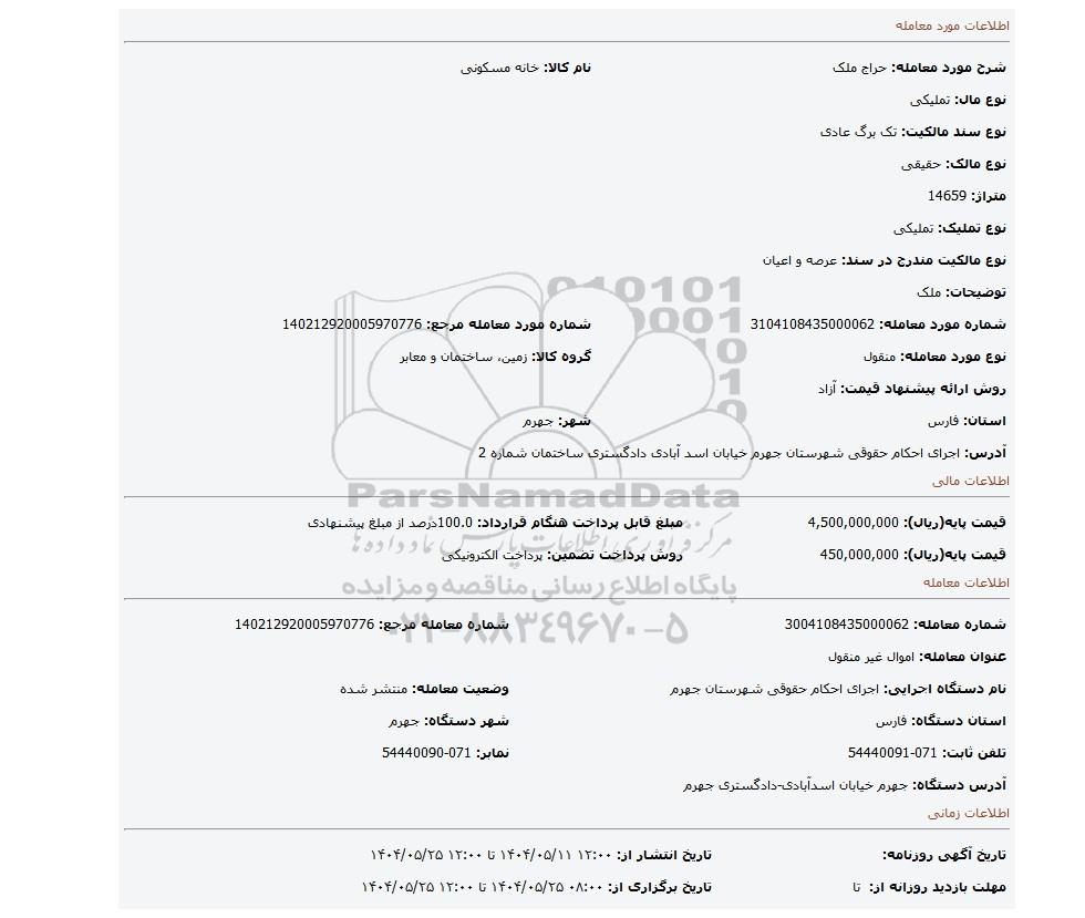 قیمت پایه(ریال): 450,000,000روش پرداخت تضمین: پرداخت الکترونیکی