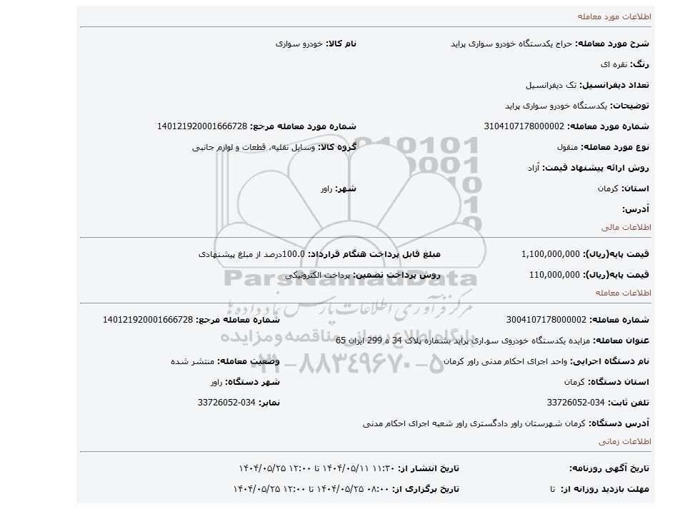 | شماره مورد معامله: 3104107178000002 | شماره مورد معامله مرجع: 140121920001666728 | |