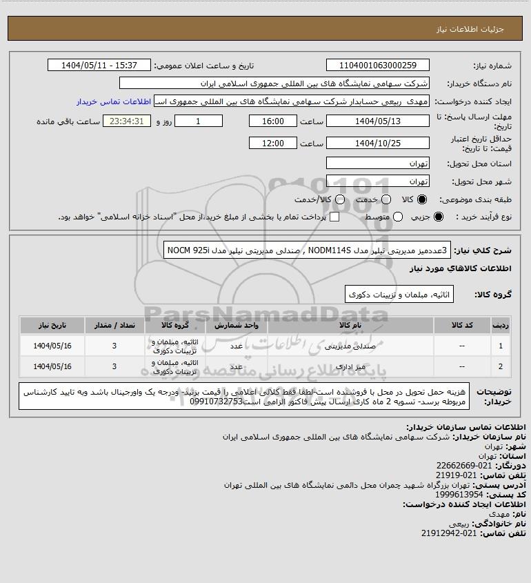 شرح کلی نیاز: 3عددمیز مدیریتی نیلپر مدل NODM114S , صندلی مدیریتی نیلپر مدل NOCM 925i