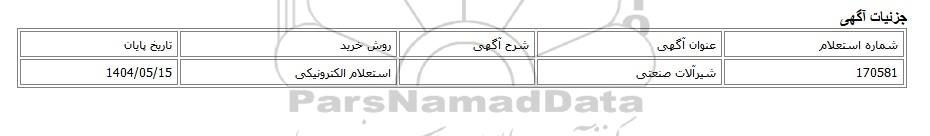 | 170581 | شیرآلات صنعتی | استعلام الکترونیکی | 1404/05/15 |