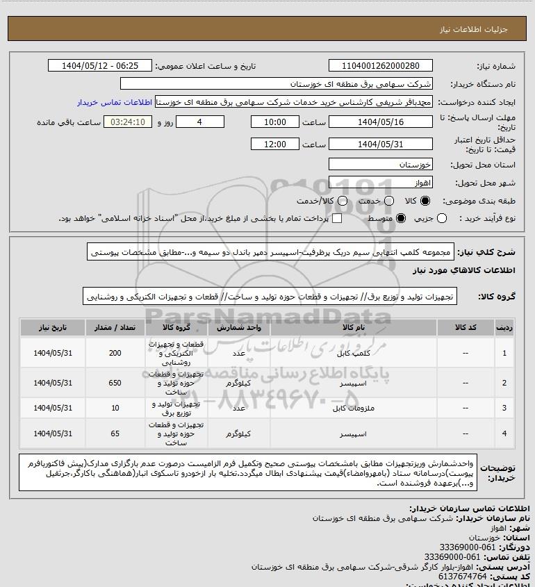 نام سازمان خریدار: شرکت سهامی برق منطقه ای خوزستان