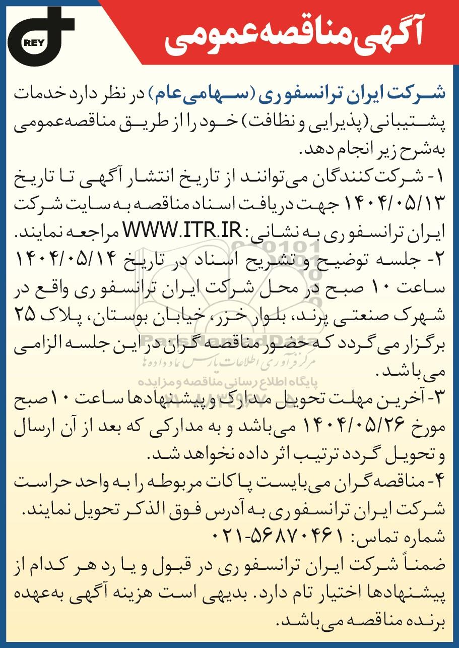 شرکت ایران ترانسفوری (سهامی عام) در نظر دارد خدمات پشتیبانی (پذیرایی و نظافت) خود را از طریق مناقصه عمومی به شرح زیر انجام دهد.