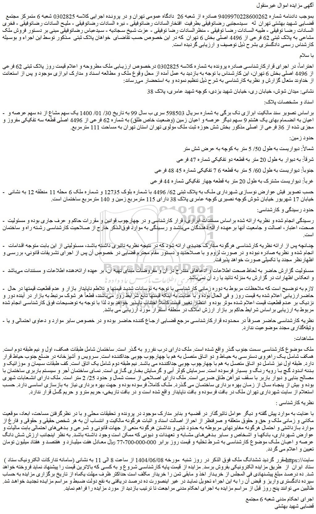بموجب دادنامه شماره 9409970228600262 صادره از شعبه 26 دادگاه عمومی تهران و در پرونده اجرایی کلاسه 0302825 شعبه 6 متمرکز مجتمع قضایی شهید بهشتی تهران له سیدمجتبی رضاتوفیقی بطرفیت افتخارالسادات رضاتوفیقی - نیره السادات رضاتوفیقی - ملیح السادات رضاتوفیقی - فخری السادات رضا توفیقی - طیبه السادات رضا توفیقی - منظرالسادات رضا توفیقی - عزت شیخ سجادیه - سیدعباس رضاتوفیقی مبنی بر دستور فروش ملک مشاعی به پلاک ثبتی 62 فرعی از 4496 اصلی بخش 6 تهران که در این خصوص حسب تقاضای خواهان پلاک ثبتی مذکور توسط این اجراء و بوسیله کارشناس رسمی دادگستری بشرح ذیل توصیف و ارزیابی گردیده است.