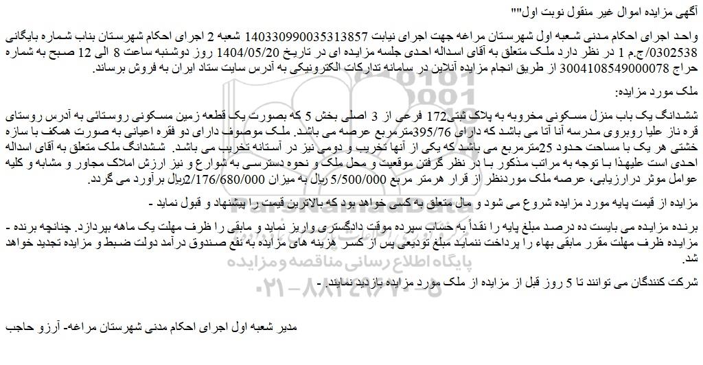 واحد اجرای احکام مدنی شعبه اول شهرستان مراغه جهت اجرای نیابت 140330990035313857 شعبه 2 اجرای احکام شهرستان بناب شماره بایگانی 0302538/ج.م 1 در نظر دارد ملک متعلق به آقای اسداله احدی جلسه مزایده ای در تاریخ 1404/05/20 روز دوشنبه ساعت 8 الی 12 صبح به شماره حراج 3004108549000078 از طریق انجام مزایده آنلاین در سامانه تدارکات الکترونیکی به آدرس سایت ستاد ایران به فروش برساند.
