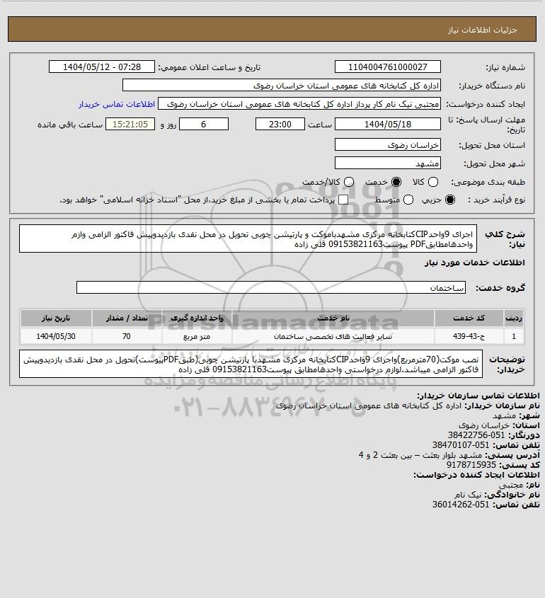 شرح کلی نیاز: اجرای 9واحدCIPکتابخانه مرکزی مشهدباموکت و پارتیشن چوبی تحویل در محل نقدی بازدیدوپیش فاکتور الزامی وازم واحدهامطابقPDF پیوست09153821163 قلی زاده