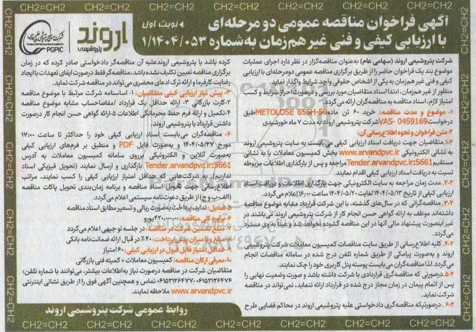 1- موضوع و مدت مناقصه : خرید 60 تن ماده METOLOSE 65SH -50 طبق درخواست VAS- 0459169 شرکت پتروشیمی اروند به مدت 7 ماه خورشیدی