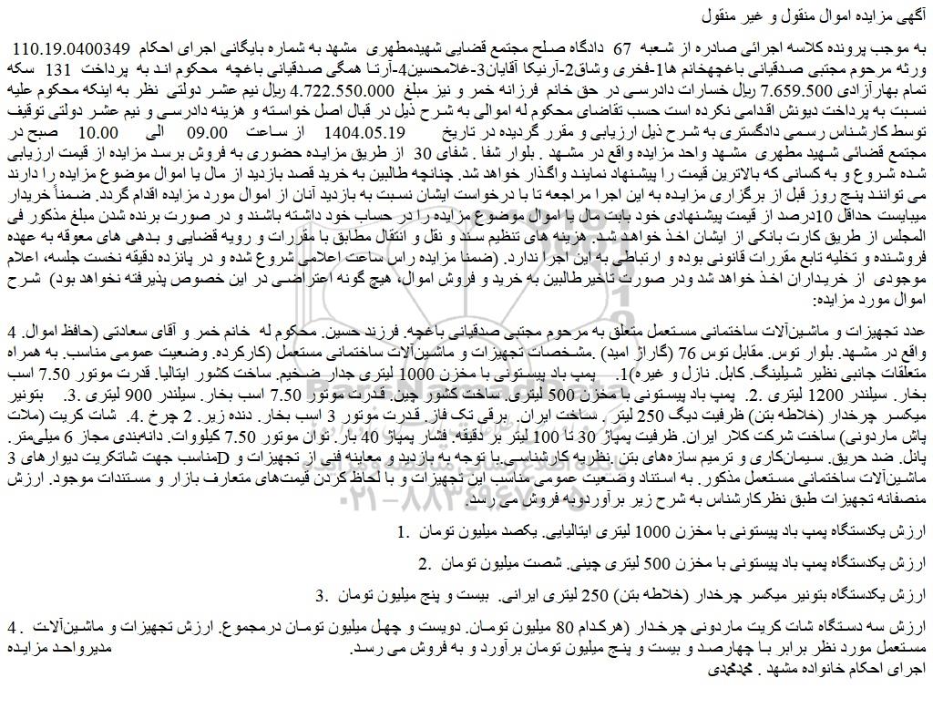 به موجب پرونده کلاسه اجرائی صادره از شعبه 67 دادگاه صلح مجتمع قضایی شهیدمطهری مشهد به شماره بایگانی اجرای احکام 110.19.0400349 ورثه مرحوم مجتبی صدقیانی باغچهخانم ها1-فخری وشاق2-آرنیکا آقایان3-غلامحسین4-آرتا همگی صدقیانی باغچه محکوم اند به پرداخت 131 سکه تمام بهارآزادی 7.659.500 ریال خسارات دادرسی در حق خانم فرزانه خمر و نیز مبلغ 4.722.550.000 ریال نیم عشر دولتی نظر به اینکه محکوم علیه نسبت به پرداخت دیونش اقدامی نکرده است حسب تقاضای محکوم له اموالی به شرح ذیل در قبال اصل خواسته و هزینه دادرسی و نیم عشر دولتی توقیف توسط کارشناس رسمی دادگستری به شرح ذیل ارزیابی و مقرر گردیده در تاریخ 1404.05.19 از ساعت 09.00 الی 10.00 صبح در مجتمع قضائی شهید مطهری مشهد واحد مزایده واقع در مشهد . بلوار شفا . شفای 30 از طریق مزایده حضوری به فروش برسد مزایده از قیمت ارزیابی شده شروع و به کسانی که بالاترین قیمت را پیشنهاد نمایند واگذار خواهد شد. چنانچه طالبین به خرید قصد بازدید از مال یا اموال موضوع مزایده را دارند می توانند پنج روز قبل از برگزاری مزایده به این اجرا مراجعه تا با درخواست ایشان نسبت به بازدید آنان از اموال مورد مزایده اقدام گردد. ضمناً خریدار میبایست حداقل 10درصد از قیمت پیشنهادی خود بابت مال یا اموال موضوع مزایده را در حساب خود داشته باشند و در صورت برنده شدن مبلغ مذکور فی المجلس از طریق کارت بانکی از ایشان اخذ خواهد شد. هزینه های تنظیم سند و نقل و انتقال مطابق با مقررات و رویه قضایی و بدهی های معوقه به عهده فروشنده و تخلیه تابع مقررات قانونی بوده و ارتباطی به این اجرا ندارد. (ضمنا مزایده راس ساعت اعلامی شروع شده و در پانزده دقیقه نخست جلسه، اعلام موجودی از خریداران اخذ خواهد شد ودر صورت تاخیرطالبین به خرید و فروش اموال، هیچ گونه اعتراضی در این خصوص پذیرفته نخواهد بود) شرح اموال مورد مزایده: