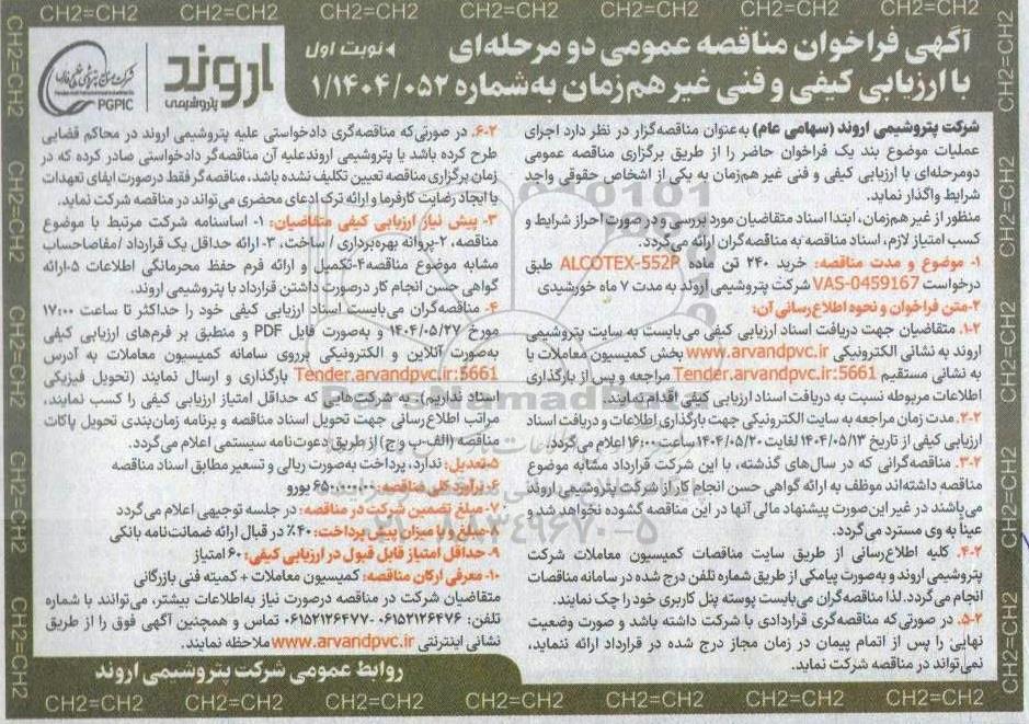 1- موضوع و مدت مناقصه : خرید 240 تن ماده ALCOTEX - 552P طبق درخواست VAS - 0459167 شرکت پتروشیمی اروند به مدت 7 ماه خورشیدی