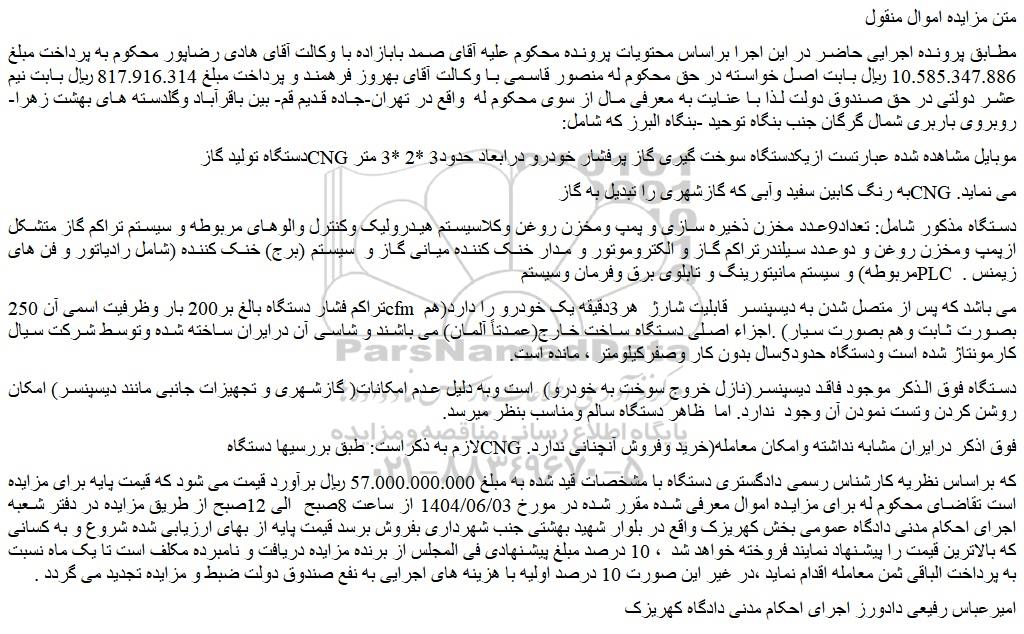 مطابق پرونده اجرایی حاضر در این اجرا براساس محتویات پرونده محکوم علیه آقای صمد بابازاده با وکالت آقای هادی رضاپور محکوم به پرداخت مبلغ 10.585.347.886 ریال بابت اصل خواسته در حق محکوم له منصور قاسمی با وکالت آقای بهروز فرهمند و پرداخت مبلغ 817.916.314 ریال بابت نیم عشر دولتی در حق صندوق دولت لذا با عنایت به معرفی مال از سوی محکوم له واقع در تهران-جاده قدیم قم- بین باقرآباد وگلدسته های بهشت زهرا- روبروی باربری شمال گرگان جنب بنگاه توحید -بنگاه البرز که شامل: