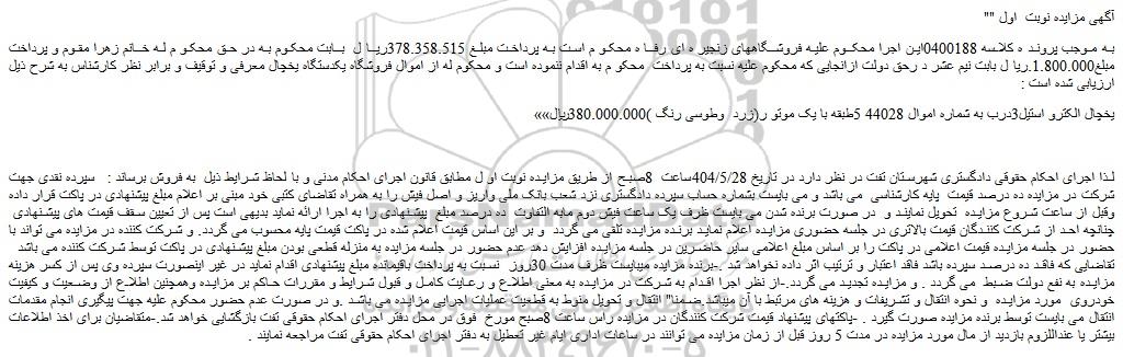 لذا اجرای احکام حقوقی دادگستری شهرستان تفت در نظر دارد در تاریخ 404/5/28ساعت 8صبح از طریق مزایده نوبت او ل مطابق قانون اجرای احکام مدنی و با لحاظ شرایط ذیل به فروش برساند : سپرده نقدی جهت شرکت در مزایده ده درصد قیمت پایه کارشناسی می باشد و می بایست بشماره حساب سپرده دادگستری نزد شعب بانک ملی واریز و اصل فیش را به همراه تقاضای کتبی خود مبنی بر اعلام مبلغ پیشنهادی در پاکت قرار داده وقبل از ساعت شروع مزایده تحویل نمایند و در صورت برنده شدن می بایست ظرف یک ساعت فیش دوم مابه التفاوت ده درصد مبلغ پیشنهادی را به اجرا ارائه نماید بدیهی است پس از تعیین سقف قیمت های پیشنهادی چنانچه احد از شرکت کنندگان قیمت بالاتری در جلسه حضوری مزایده اعلام نماید برنده مزایده تلقی می گردد و بر این اساس قیمت اعلام شده در پاکت قیمت پایه محسوب می گردد. و شرکت کننده در مزایده می تواند با حضور در جلسه مزایده قیمت اعلامی در پاکت را بر اساس مبلغ اعلامی سایر حاضرین در جلسه مزایده افزایش دهد عدم حضور در جلسه مزایده به منزله قطعی بودن مبلغ پیشنهادی در پاکت توسط شرکت کننده می باشد تقاضایی که فاقد ده درصد سپرده باشد فاقد اعتبار و ترتیب اثر داده نخواهد شد .-برنده مزایده میبایست ظرف مدت 30روز نسبت به پرداخت باقیمانده مبلغ پیشنهادی اقدام نماید در غیر اینصورت سپرده وی پس از کسر هزینه مزایده به نفع دولت ضبط می گردد . و مزایده تجدید می گردد.-از نظر اجرا اقدام به شرکت در مزایده به معنی اطلاع و رعایت کامل و قبول شرایط و مقررات حاکم بر مزایده وهمچنین اطلاع از وضعیت و کیفیت خودروی مورد مزایده و نحوه انتقال و تشریفات و هزینه های مرتبط با آن میباشد.ضمنا" انتقال و تحویل منوط به قطعیت عملیات اجرایی مزایده می باشد .و در صورت عدم حضور محکوم علیه جهت پیگیری انجام مقدمات انتقال می بایست توسط برنده مزایده صورت گیرد . -پاکتهای پیشنهاد قیمت شرکت کنندگان در مزایده راس ساعت 8صبح مورخ فوق در محل دفتر اجرای احکام حقوقی تفت بازگشایی خواهد شد.-متقاضیان برای اخذ اطلاعات بیشتر یا عنداللزوم بازدید از مال مورد مزایده در مدت 5 روز قبل از زمان مزایده می توانند در ساعات اداری ایام غیر تعطیل به دفتر اجرای احکام حقوقی تفت مراجعه نمایند .