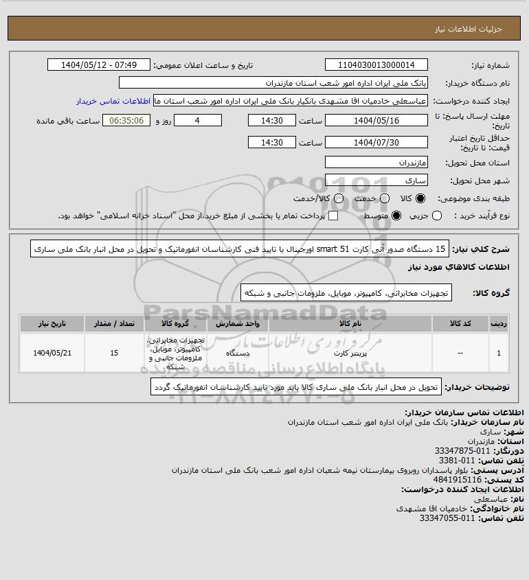 شرح کلی نیاز: 15 دستگاه صدور آنی کارت smart 51 اورجینال با تایید فنی کارشناسان انفورماتیک و تحویل در محل انبار بانک ملی ساری