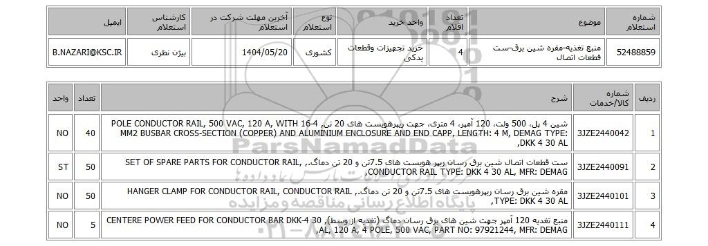 | 1 | 3JZE2440042 | شین 4 پل، 500 ولت، 120 آمپر، 4 متری، جهت ریپرهویست های 20 تن, 4-POLE CONDUCTOR RAIL, 500 VAC, 120 A, WITH 16 MM2 BUSBAR CROSS-SECTION (COPPER) AND ALUMINIUM ENCLOSURE AND END CAPP, LENGTH: 4 M, DEMAG TYPE: DKK 4 30 AL, | 40 | NO |