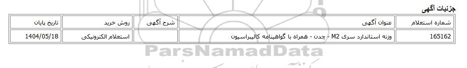 | 165162 | وزنه استاندارد سری M2 - چدن - همراه با گواهینامه کالیبراسیون | استعلام الکترونیکی | 1404/05/18 |
