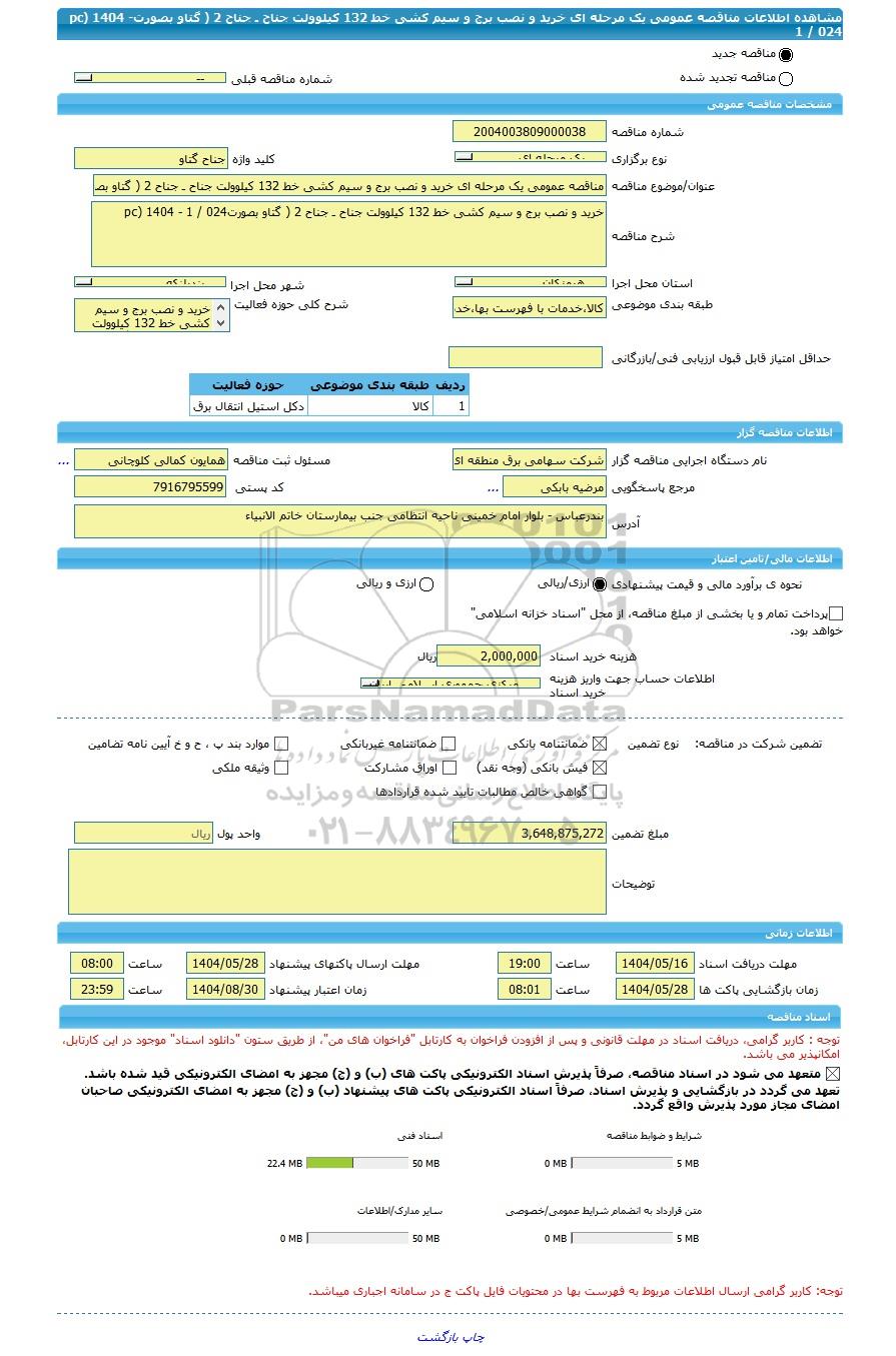 | مبلغ تضمین | 3,648,875,272 | واحد پول | ریال |