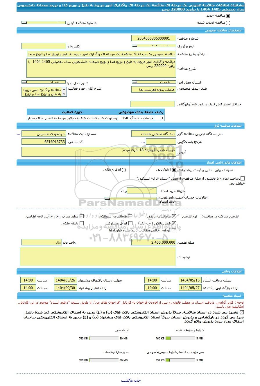 مناقصه مناقصه عمومی یک مرحله ای مناقصه یک مرحله ای واگذاری امور مربوط به طبخ و توزیع غذا و توزیع صبحانه دانشجویی سال تحصیلی 1405-1404 با برآورد 220000 پرس, مناقصه، مناقصه عمومی یک مرحله ای مناقصه یک مرحله ای واگذاری امور مربوط به طبخ و توزیع غذا و توزیع صبحانه دانشجویی سال تحصیلی 1405-1404 با برآورد 220000 پرس