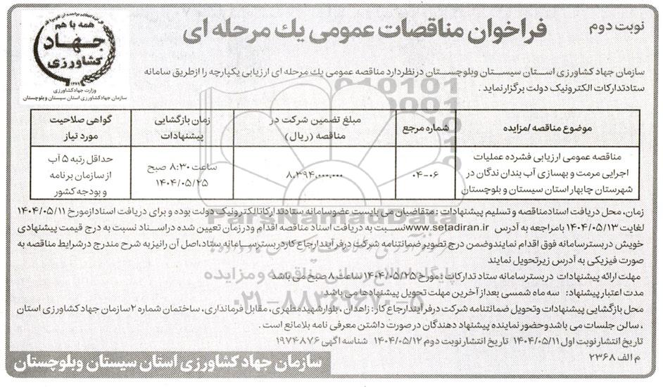 | مناقصه عمومی ارزیابی فشرده عملیات اجرایی مرمت و بهسازی آب بندان ندگان در شهرستان چابهار استان سیستان و بلوچستان | 06 - 04 | 8.394.000.000 | ساعت 8:30 صبح 1404.5.25 | حدتقل رتبه 5 آب از سازمان برنامه و بودجه کشور |