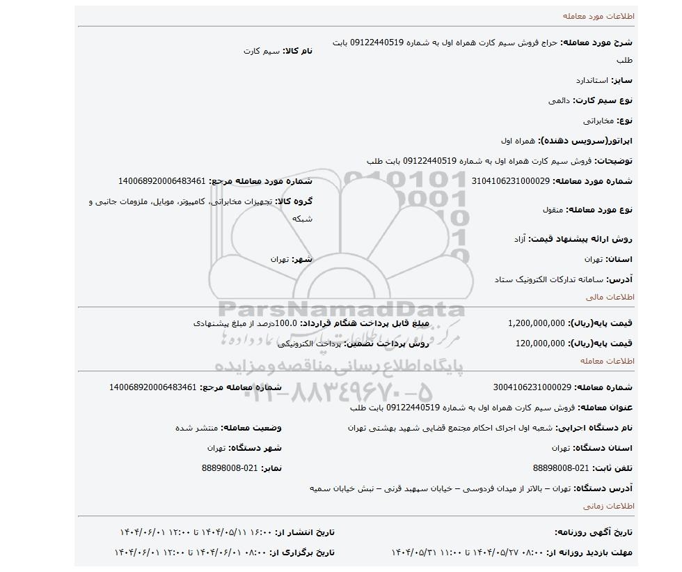 | عنوان معامله: فروش سیم کارت همراه اول به شماره 09122440519 بابت طلب | ||