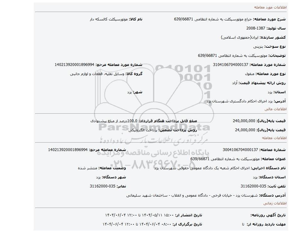 | عنوان معامله: موتورسیکلت به شماره انتظامی 639/66871 | ||