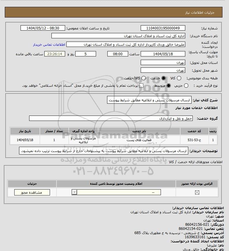 شرح کلی نیاز: ارسال مرسولات پستی و ابلاغیه مطابق شرایط پیوست