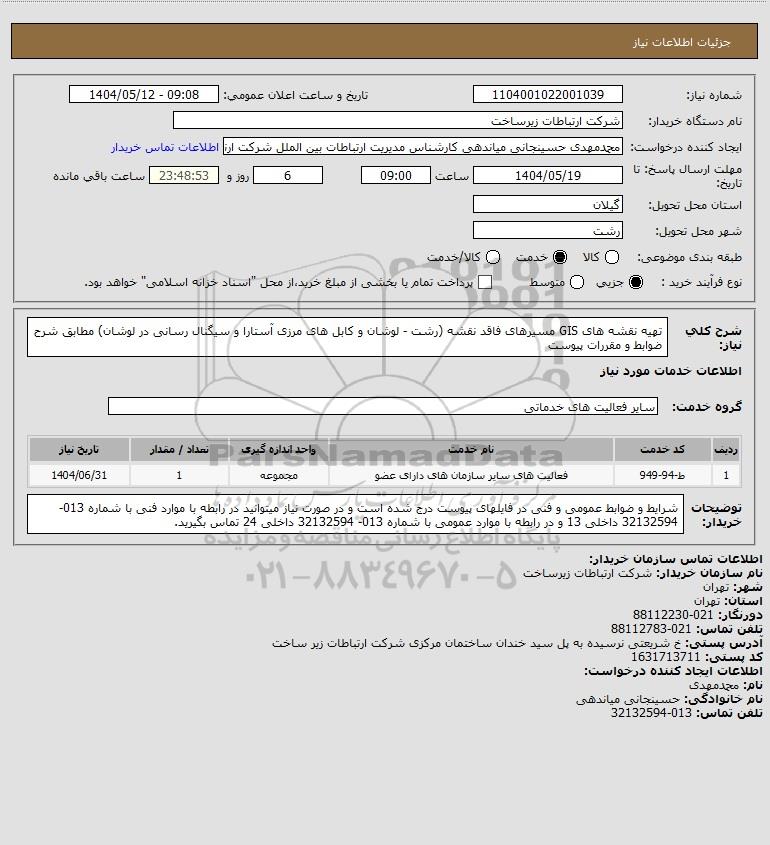 شرح کلی نیاز: تهیه نقشه های GIS مسیرهای فاقد نقشه (رشت - لوشان و کابل های مرزی آستارا و سیگنال رسانی در لوشان) مطابق شرح ضوابط و مقررات پیوست
