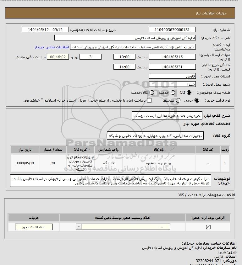 نام سازمان خریدار: اداره کل اموزش و پرورش استان فارس