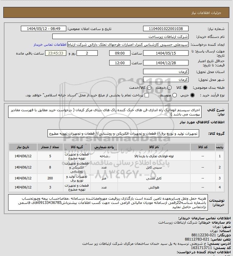 | 3 | -- | کابل مسی | متر | تجهیزات تولید و توزیع برق | 200 | 1404/06/12 |