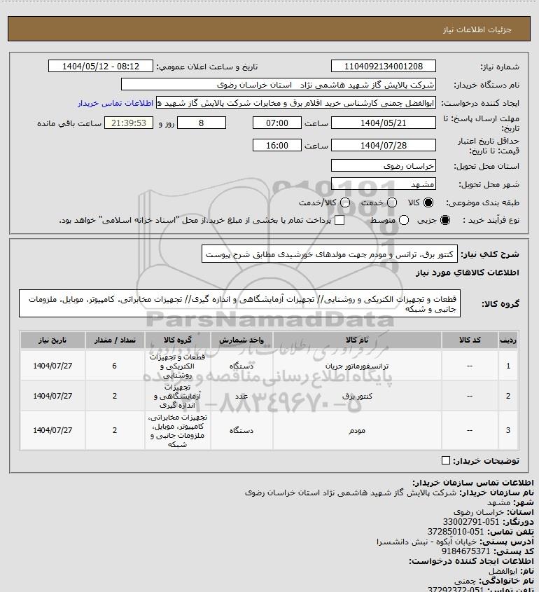 شرح کلی نیاز: کنتور برق، ترانس و مودم جهت مولدهای خورشیدی مطابق شرح پیوست