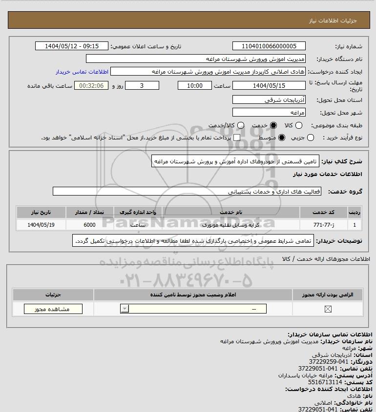 شرح کلی نیاز: تامین قسمتی از خودروهای اداره آموزش و پرورش شهرستان مراغه