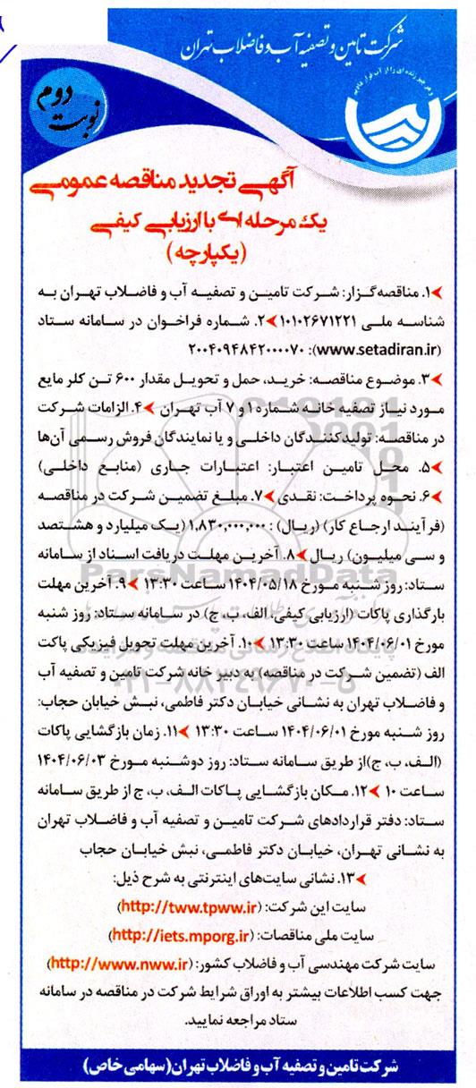 3-موضوع تجدید مناقصه: خرید حمل و تحویل مقدار 600 تن کلر مایع مورد نیاز تصفیه خانه شماره 1 و 7 آب تهران