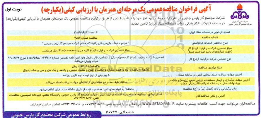 شرکت مجتمع گاز پارس جنوبی در نظر دارد خدمات مورد نیاز خود را با شرایط ذیل به صورت برگزاری مناقصه عمومی یک مرحله ای همزمان با ارزیابی کیفی (یکپارچه) در سامانه تدارکات الکترونیکی دولت (سامانه ستاد ایران) تامین نماید: