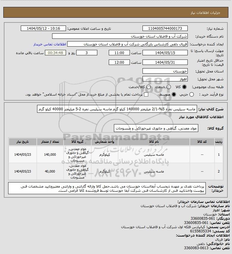| 2 | -- | ماسه سیلیس | کیلوگرم | مواد معدنی، گیاهی و جانوری غیرخوراکی و منسوجات | 40,000 | 1404/05/23 |