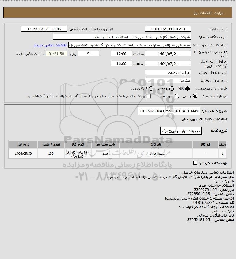شرح کلی نیاز: TIE WIRE,MAT.:SS304,DIA.:1.6MM