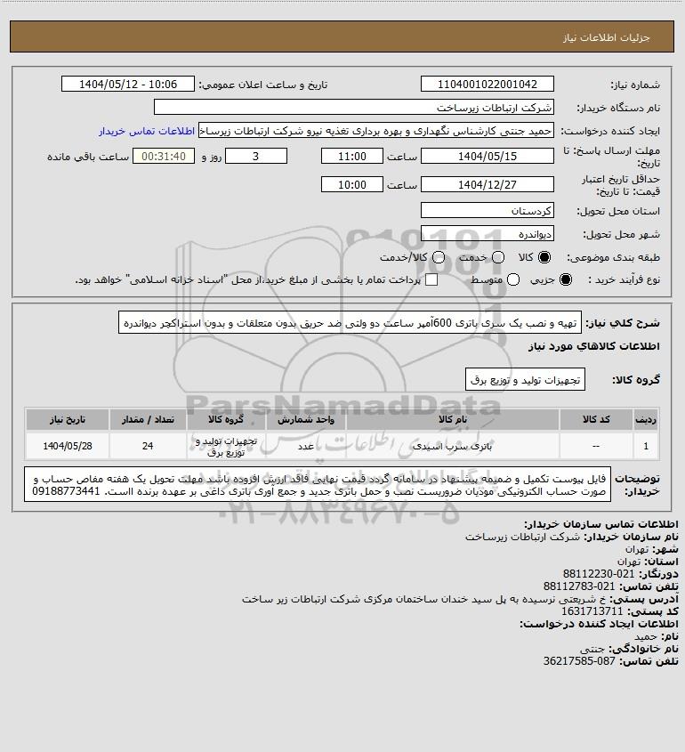 استعلام تهیه و نصب یک سری باتری 600آمپر ساعت دو ولتی ضد حریق بدون متعلقات و بدون استراکچر دیواندره ؟