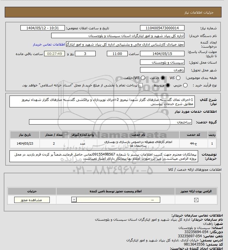 استعلام 1-اجرای نمای گلدسته منارهای گلزار شهدا نیمروز 2-اجرای نورپردازی و برقکشی گلدسته منارهای گلزار شهداء نیمروز مطابق شرح خدمات پیوستی, استعلام 1-اجرای نمای گلدسته منارهای گلزار شهدا نیمروز 2-اجرای نورپردازی و برقکشی گلدسته منارهای گلزار شهداء نیمروز مطابق شرح خدمات پیوستی
