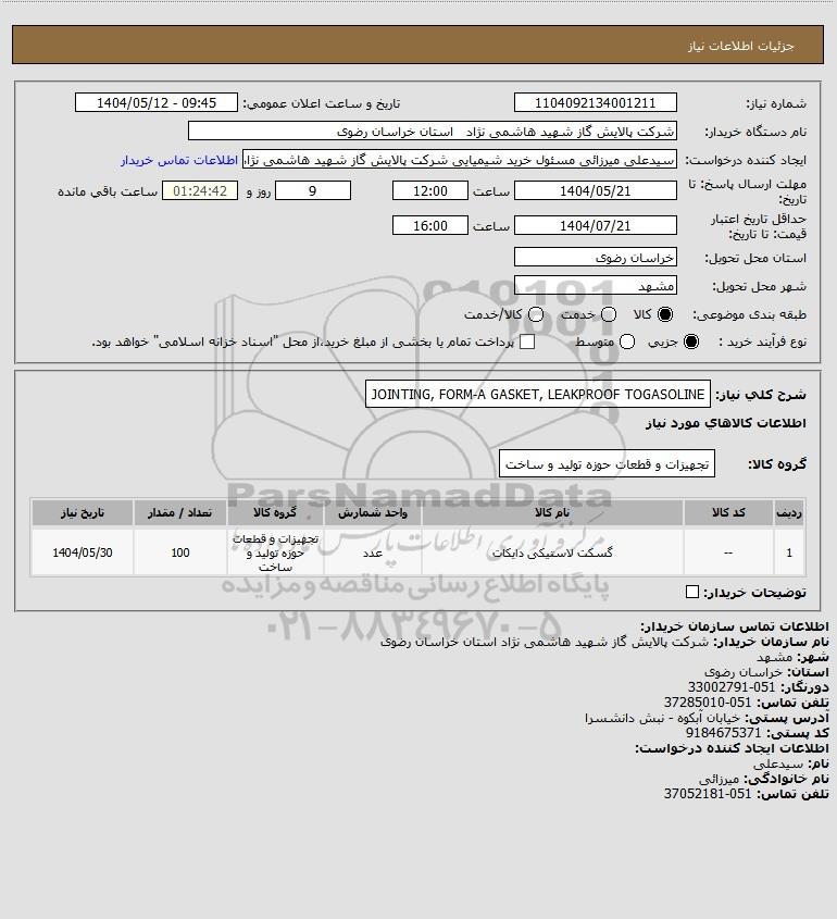 شرح کلی نیاز: JOINTING, FORM-A GASKET, LEAKPROOF TOGASOLINE
