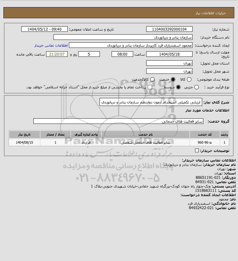 شرح کلی نیاز: ارزیابی تکمیلی استخدام آزمون دوازدهم سازمان بنادر و دریانوردی