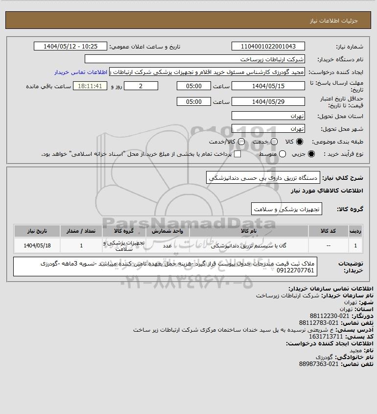 | 1 | -- | گان یا سیستم تزریق دندانپزشکی | عدد | تجهیزات پزشکی و سلامت | 1 | 1404/05/18 |