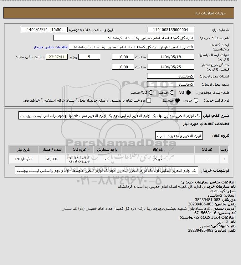 شرح کلی نیاز: پک لوازم التحریر ابتدایی اول پک لوازم التحریر ابتدایی دوم پک لوازم التحریر متوسطه اول و دوم براساس لیست پیوست